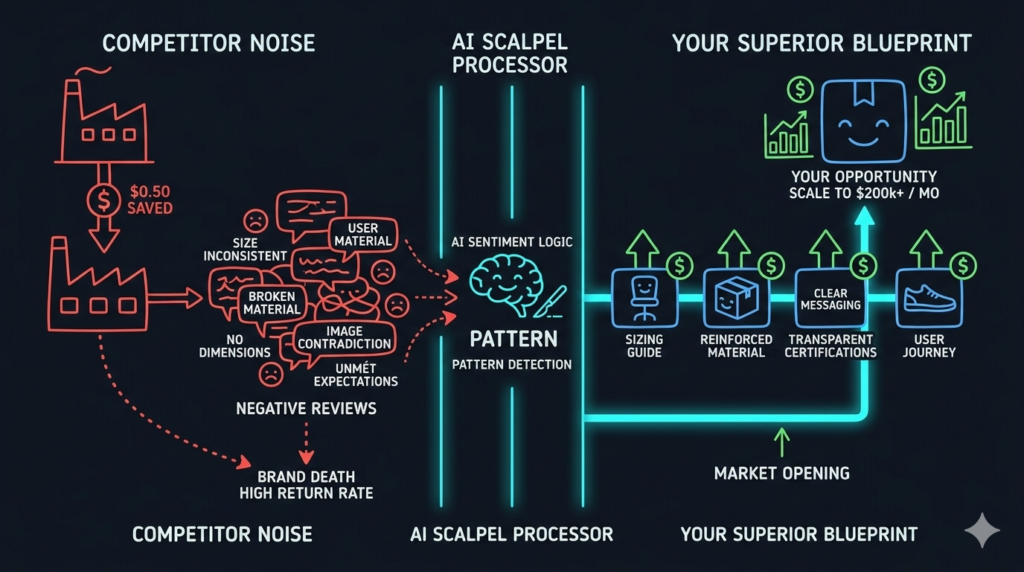 Imagine having an army of analysts reading every complaint, every return, and every sigh of frustration from your competitors’ customers around the clock. That is what AI logic provides. It doesn’t “read comments”—it detects engineering patterns and emotional voids. When a customer writes, “I love the design, but it broke after a week,” most sellers see a bad review. A strategist sees a market opening: the flaw lies in the material, the solution in the reinforcement, and the outcome in capturing the entire segment your competitor is currently disappointing.